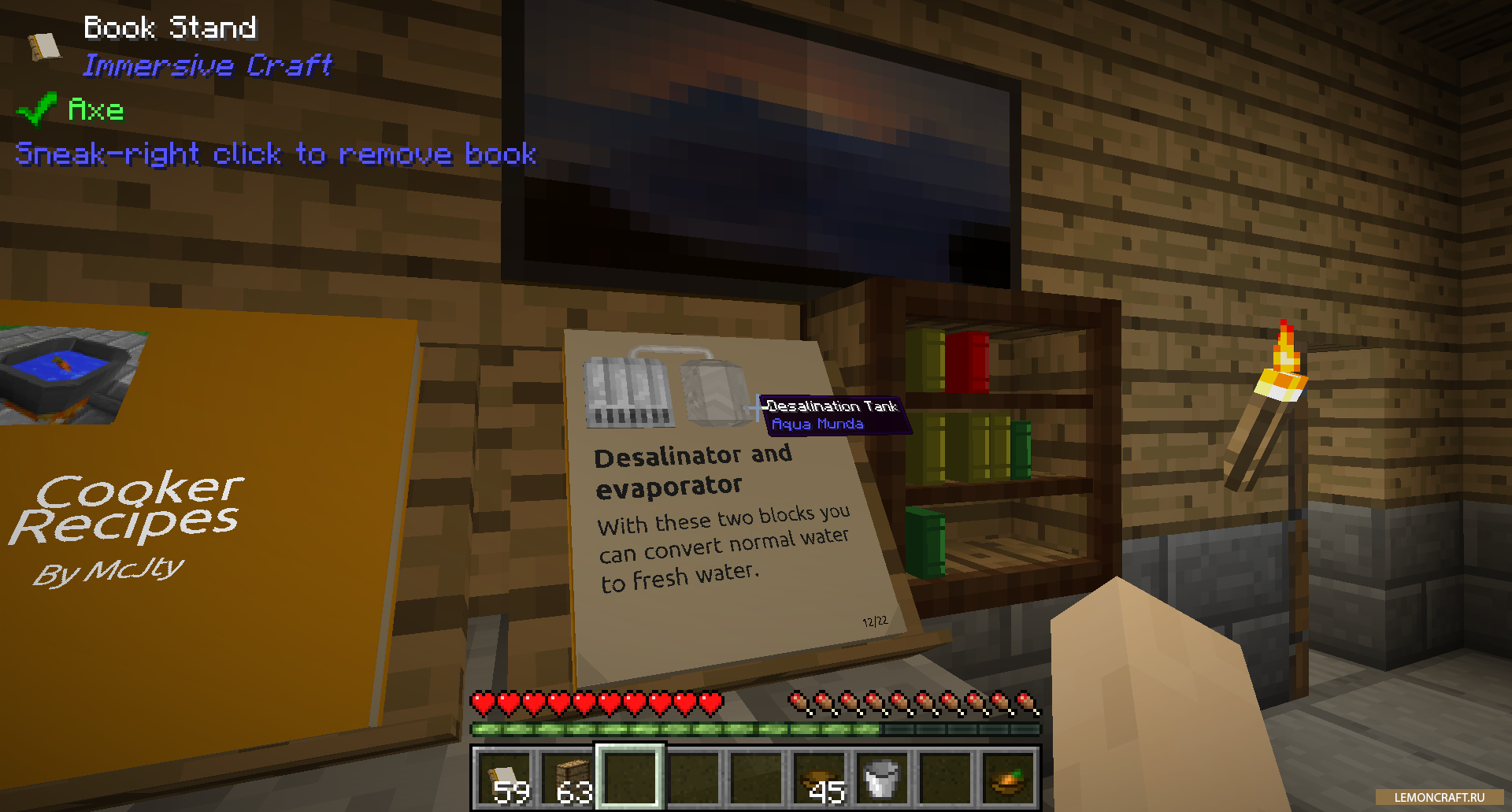 Теперь работать с водой станет намного проще и интереснее. Мод Aqua Munda добавляет в игру специальные устройства, которые упрощают добычу воды, ее очистку и передвижения до места назначения. Так же в игре появятся разделочная доска и котел, с помощью которых можно приготовить пищу.